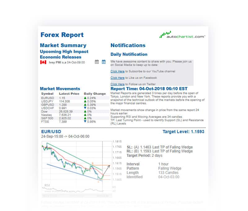 Trends and patterns take time to identify. Autochartist can generate notifications when emerging and completed chart patterns like Triangles, Wedges, Tops and Bottoms are identified. Additionally, an illustrated forecast range on completed patterns indicates expected price levels.